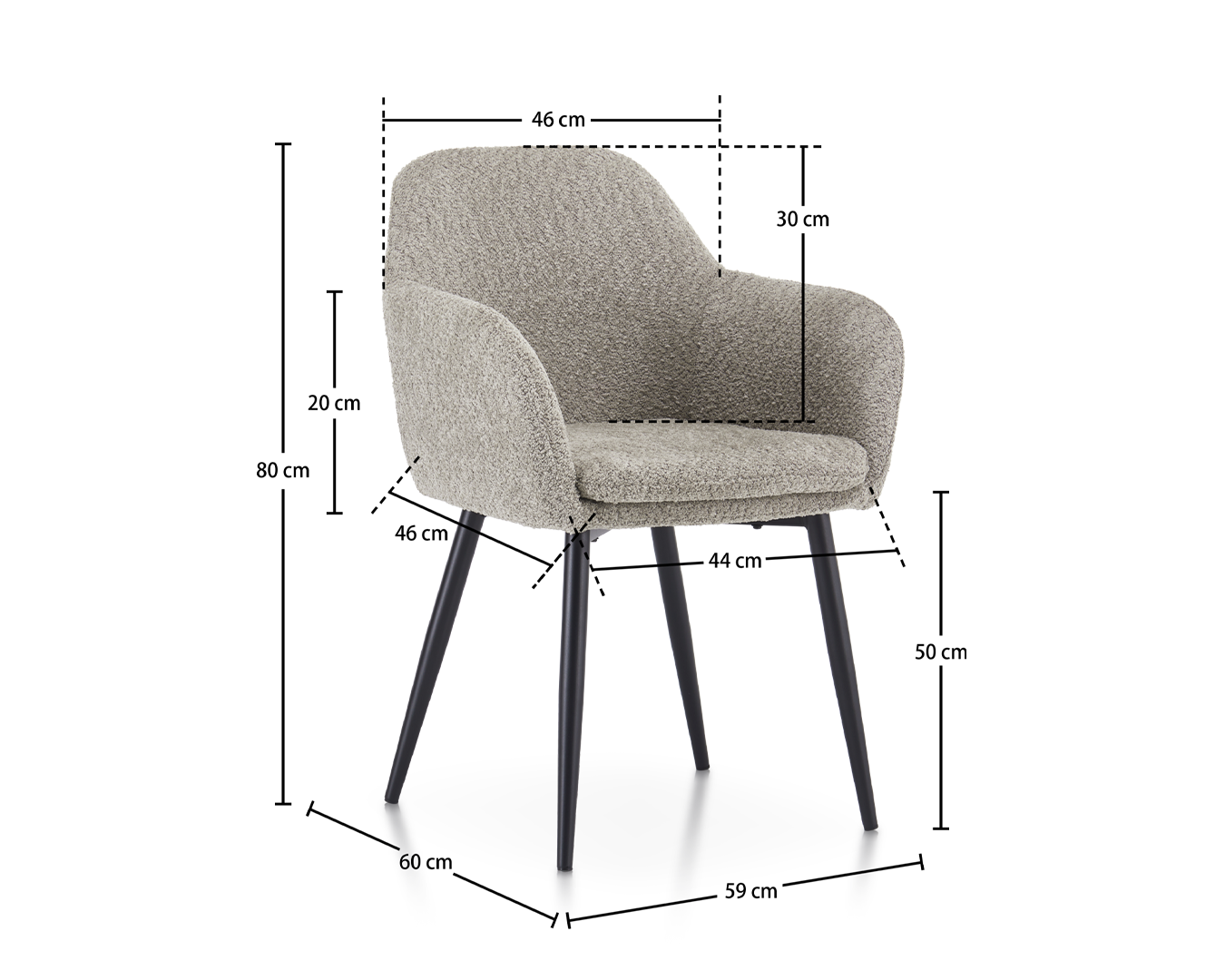• Ergonomski dizajn osigurava optimalnu podršku, što ga čini savršenim za duge večere ili ležerne obroke, dok elegantne crne metalne noge dodaju dodir sofisticiranosti i stabilnosti, nesmetano se miješajući s bilo kojim dekorom.